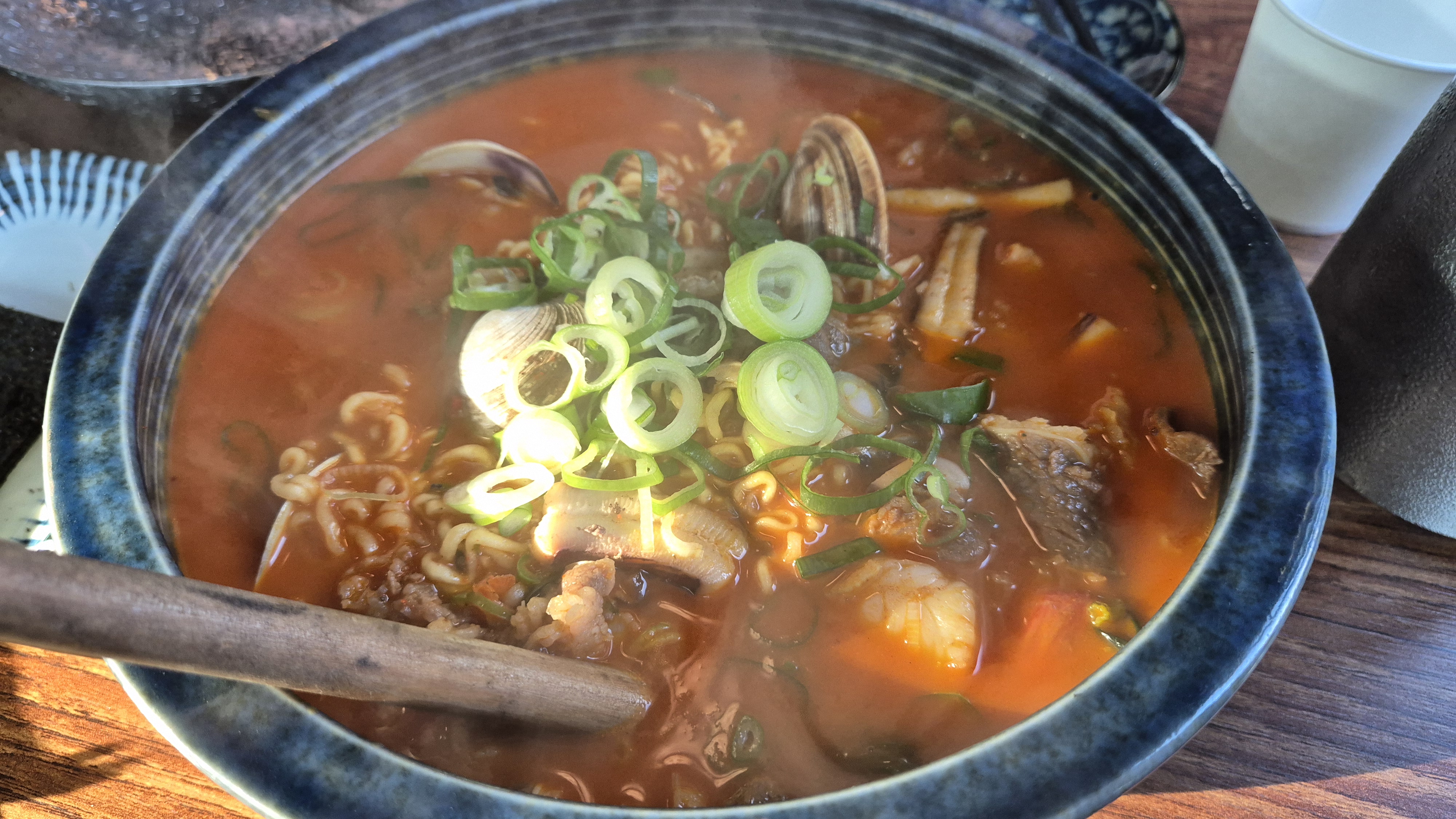 버너 없이 두꺼운 도자기 그릇에 가득히 담겨온 해물라면!