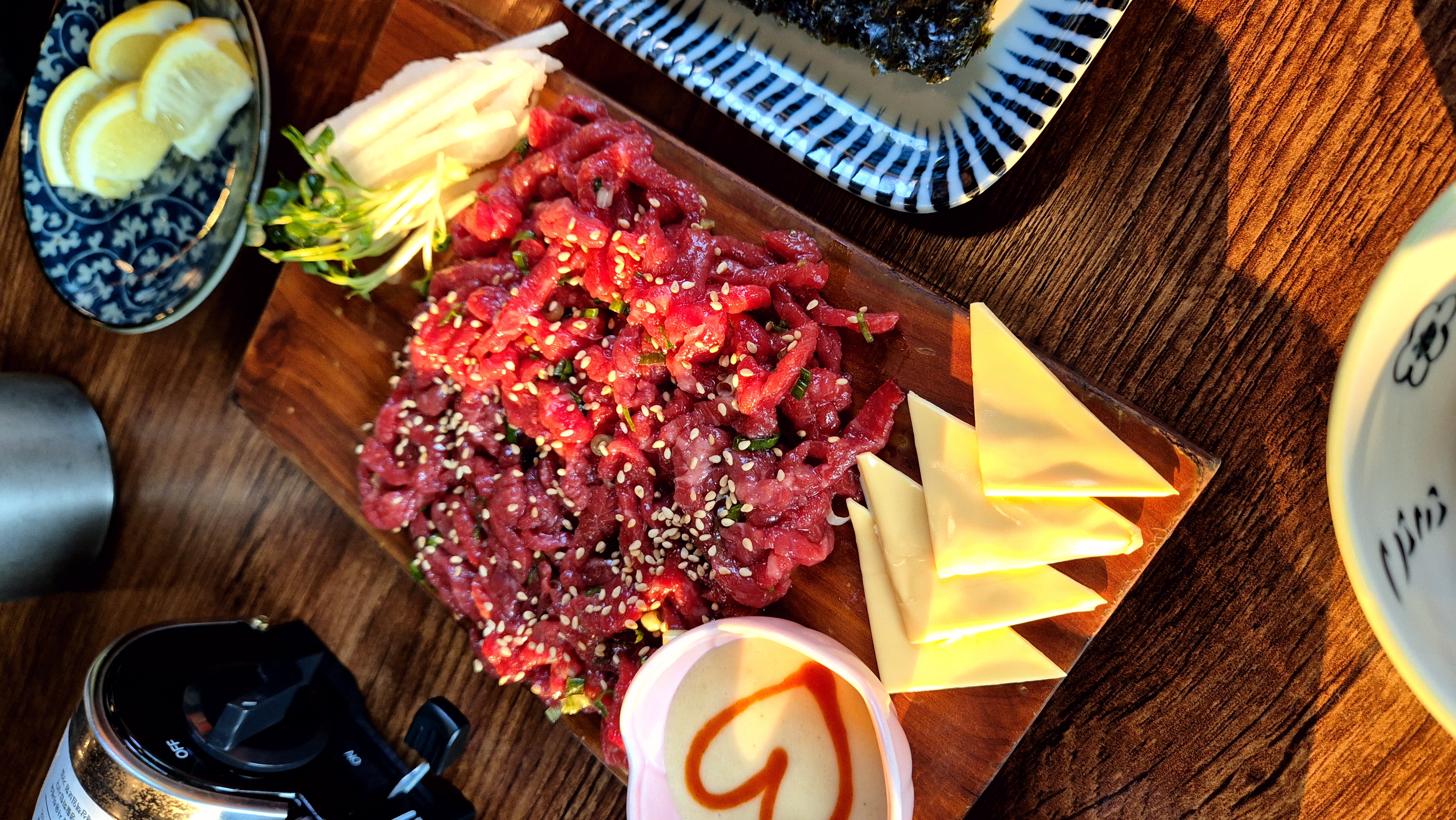 메뉴판 페이지 넘 많아서 안찍어왔는데 국물안주+단새우+육회 세트 주문했다